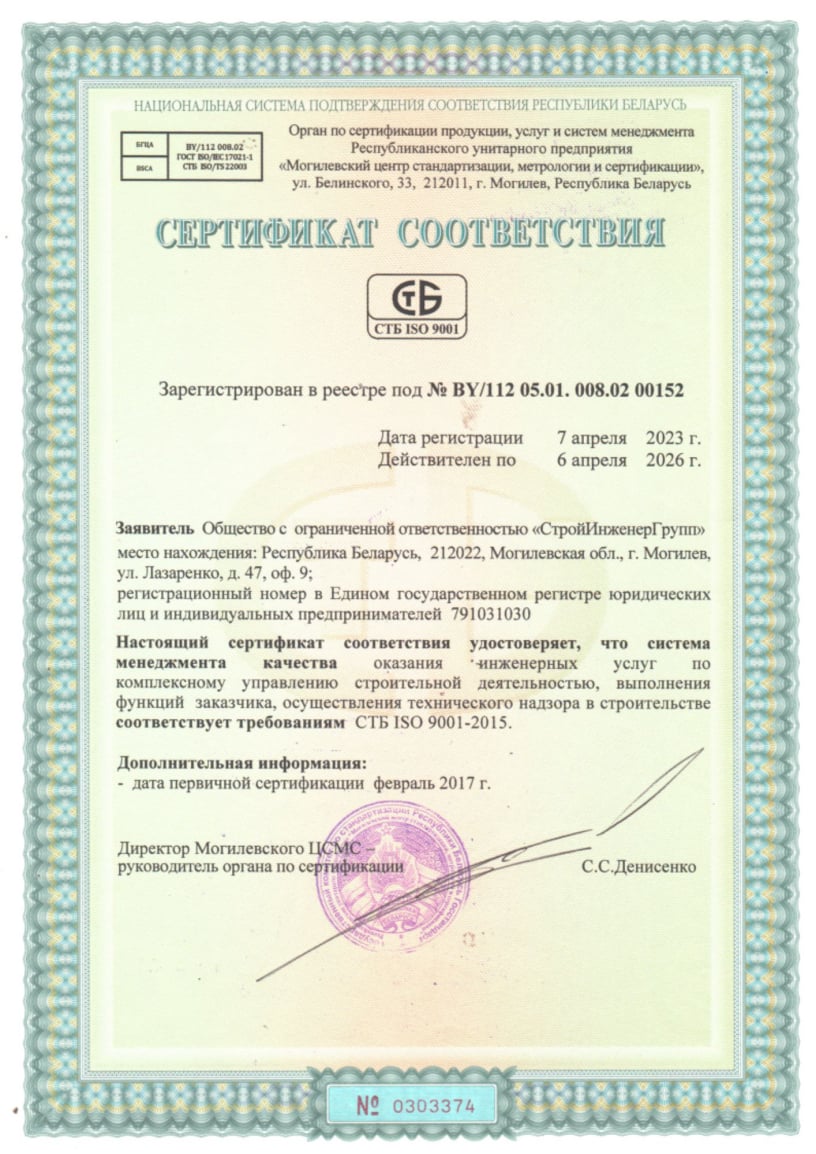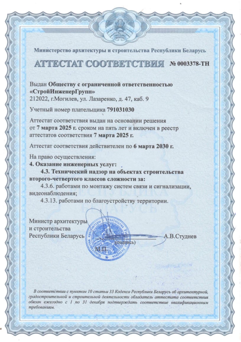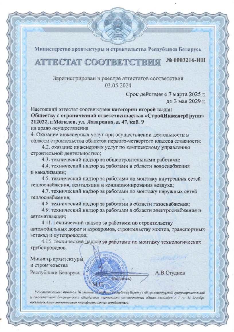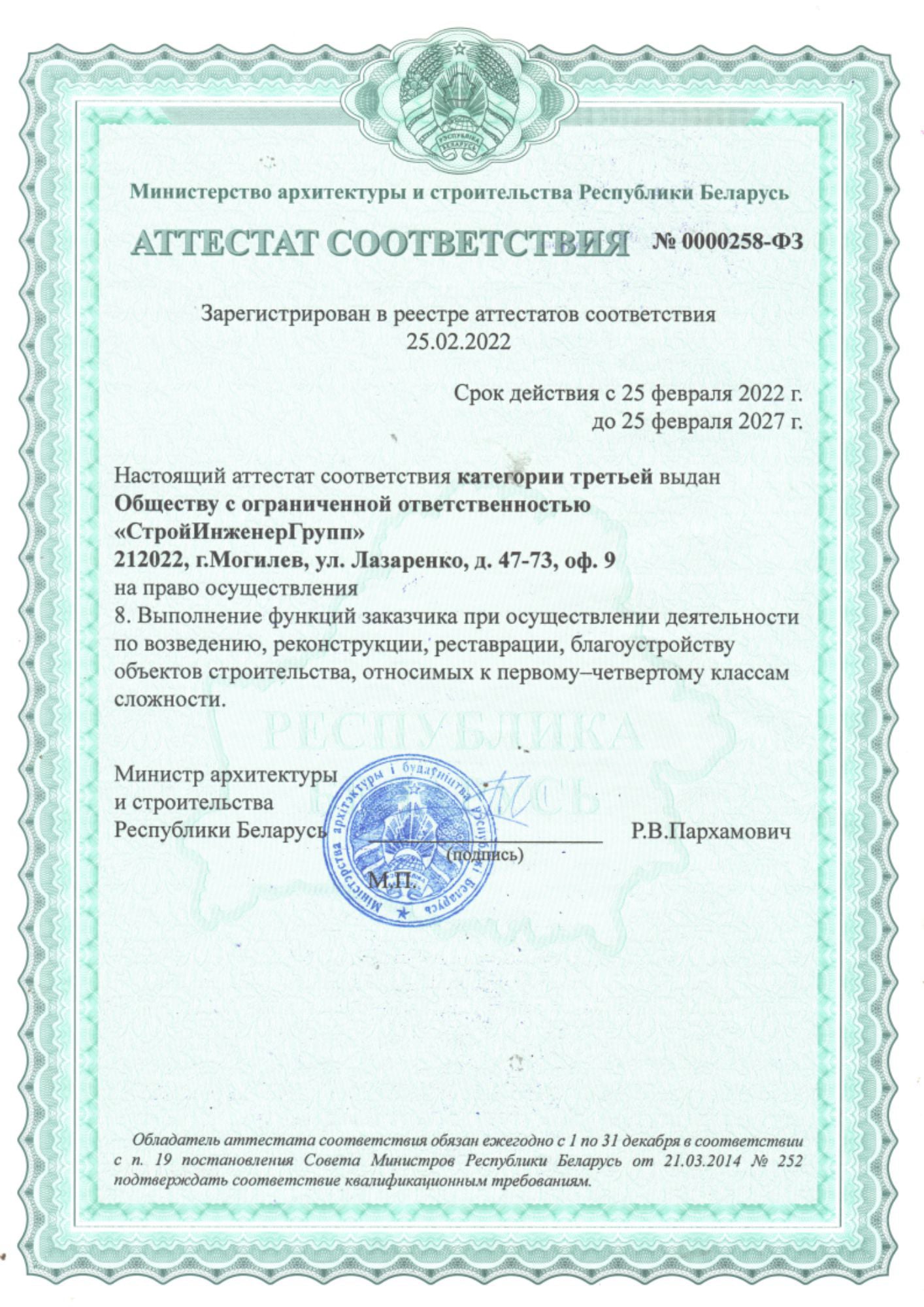 Мы осуществляем деятельность с 2016 года, зарегистрированы в реестре аттестатов соответствия Министерства Архитектуры и строительства за № 0002143-ИН с выдачей аттестатов соответствия. Это дает нам право на выполнение функций заказчика, застройщика, оказание инженерных услуг при осуществлении деятельности в области строительства объектов третьего класса сложности по СТБ 2331-2014 «Здания и сооружения. Классификация. Основные положения».